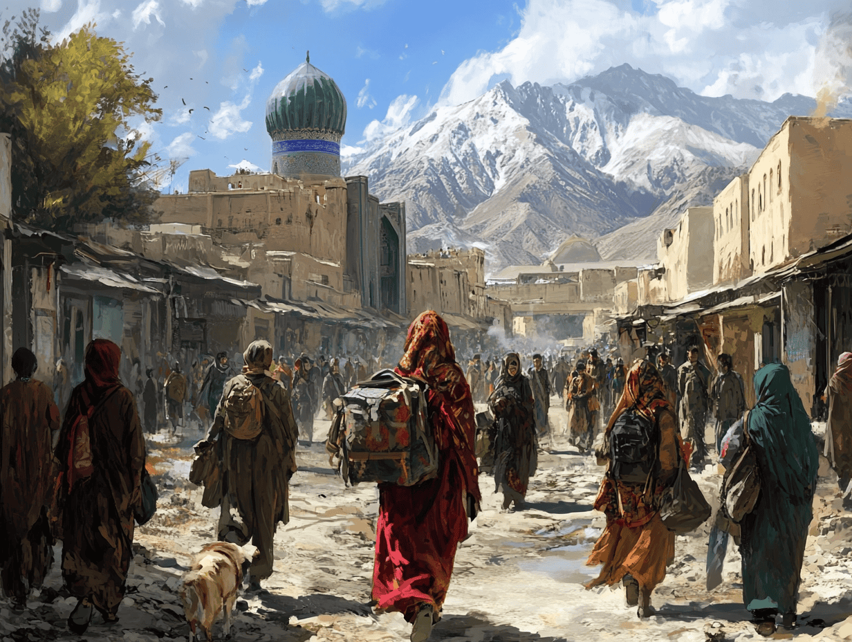 The mosque dome, the mountain ranges, and the bustling market symbolize Afghanistan’s timeless cultural heritage and its potential for renewal.